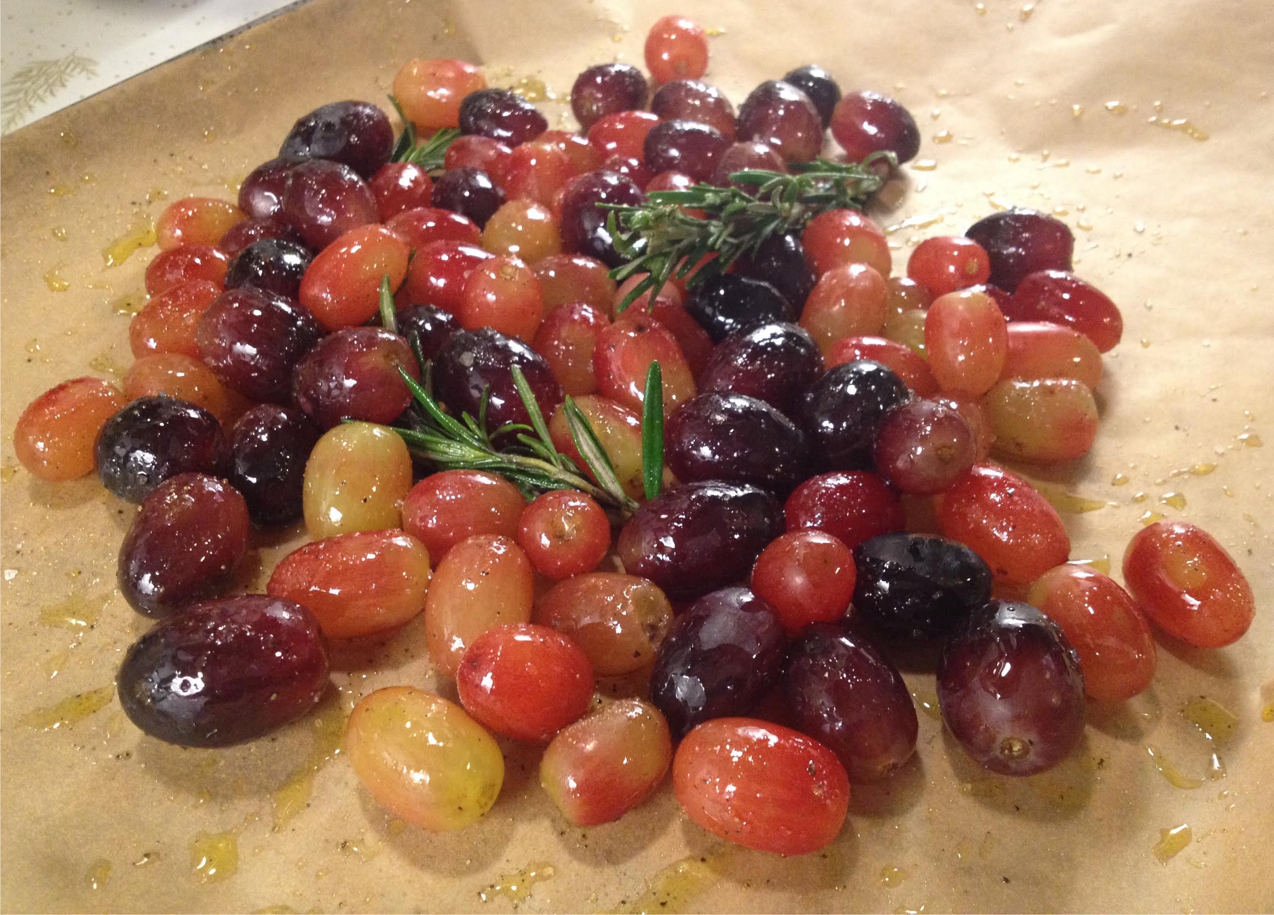 On to my appetizer – this could be a great starter to your next holiday meal and perfect for New Year’s Eve. The basis of this recipe came from a recent Food and Wine magazine, but of course, I have changed it. The roasted grapes end up looking like olives so this can be a delightful sweet surprise when you bite into it as the roasting only heightens the sweetness of the grapes.